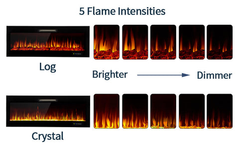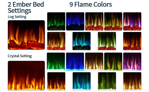 ☀【Realistic Flame Effect】Ultra High-Intensity LED lights provide very bright and realistic flame effect. Two options for an ember bed: a Log set or crystal stones to meet your need. 9 different flame color settings cater to your desired ambiance. The flame effect can be operated with or without heat for year-round ambiance. 5 color intensities to control the brightness from bright to dim.