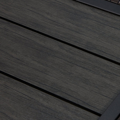 Durable Tabletop-Unique tabletop with wood grain adds realistic and retro style to your garden. Our upgraded wood plastic composite tabletop measures 43.7” length and 27.56” width covering a large placing area for gathering or dining. The tabletop can withstand temperatures about 60-70℃. We do not recommend placing hot food on it in order to protect the top.