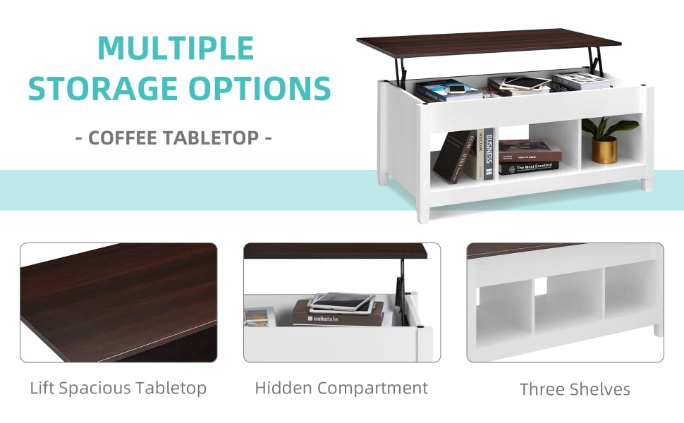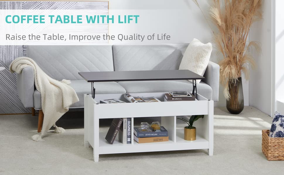 Homrest lift top coffee table, rising dining table with hidden storage and open shelves for living room, white