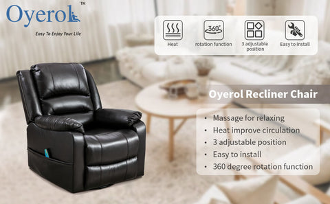 • Easy to Clean and InstallThe massage recliner chair is made of High-quality PU leather,If you spill a drink or food on your chair, just wipe it off with a wet towel.It takes only several steps to assemble the chair,with an instruction manual inside and no extra tools are needed.