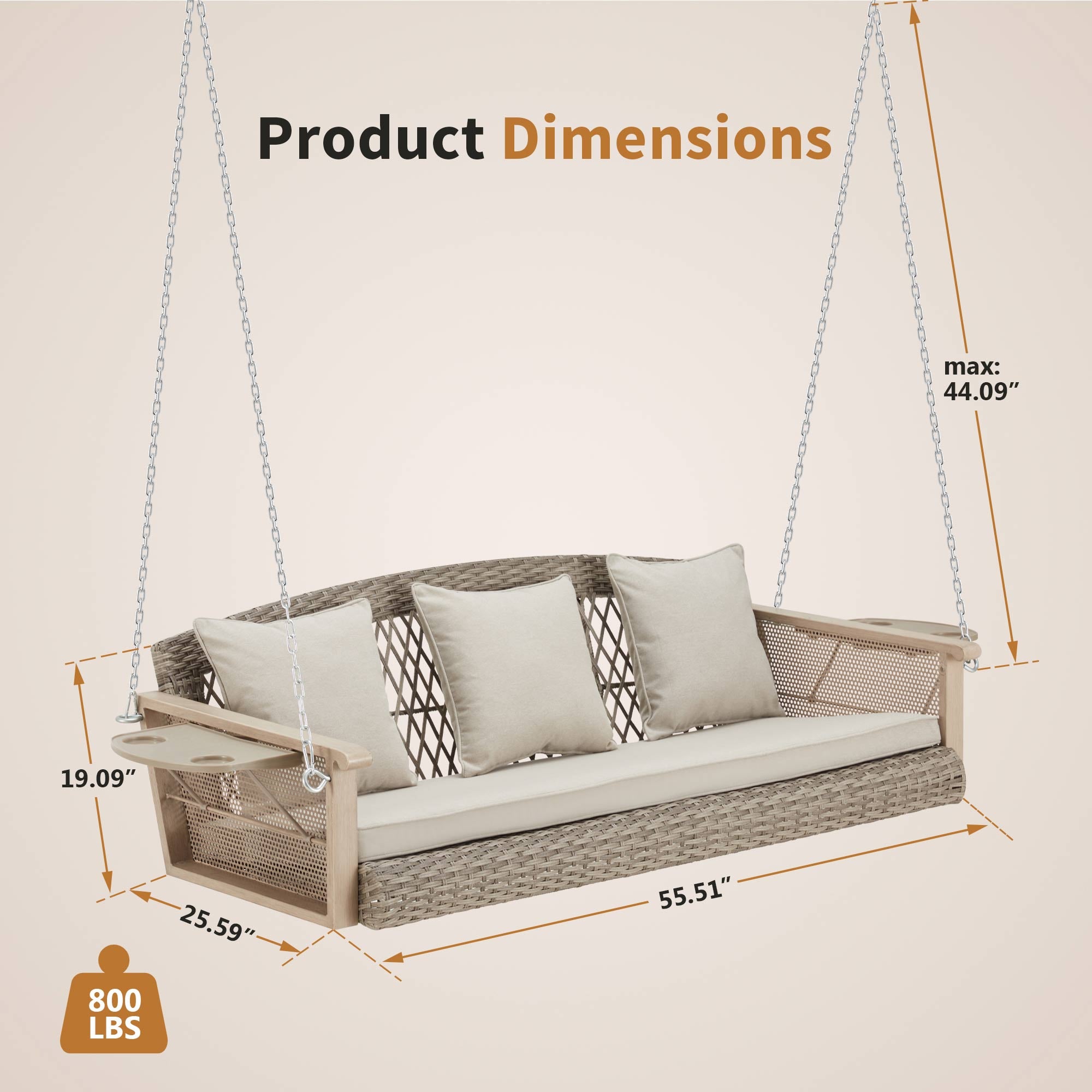 This swing is lovely. This swing was chosen since the previous owner of my home had hooks spaced 55 inches apart, and I wanted one that would look well. You'll see in the image that the drink holders have been folded down to keep them from colliding with the house or hand railing. They are simple to manually fold up or down. The drink holders' depth may not seem like much, but as long as you don't overdo it, they should be adequate.