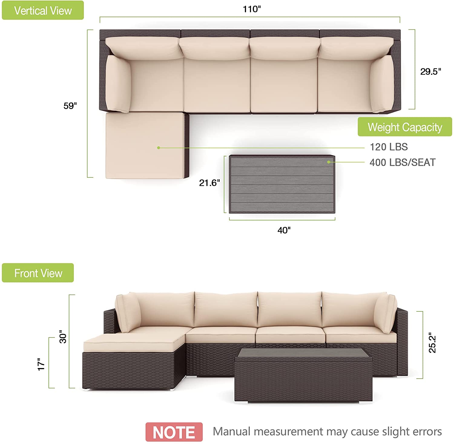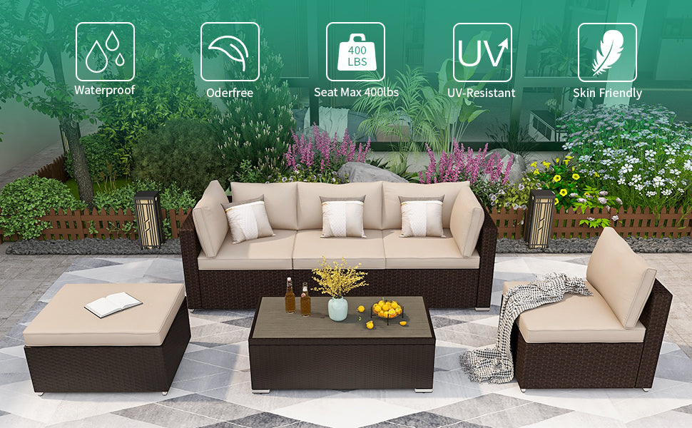 Our 6 Pcs Outdoor Rattan Sectional Sofa tightly woven with a sturdy and powder-coated steel frame inside and high tensile strength PE wicker outside, also matched with a complete set of cushions and cushions, designed for all-weather conditions. This patio sectional sets, simple and modern,is suitable for every family, warm family time, private talking and weekend gathering of friends. Please do not miss the chance of patio furniture sets clearance!