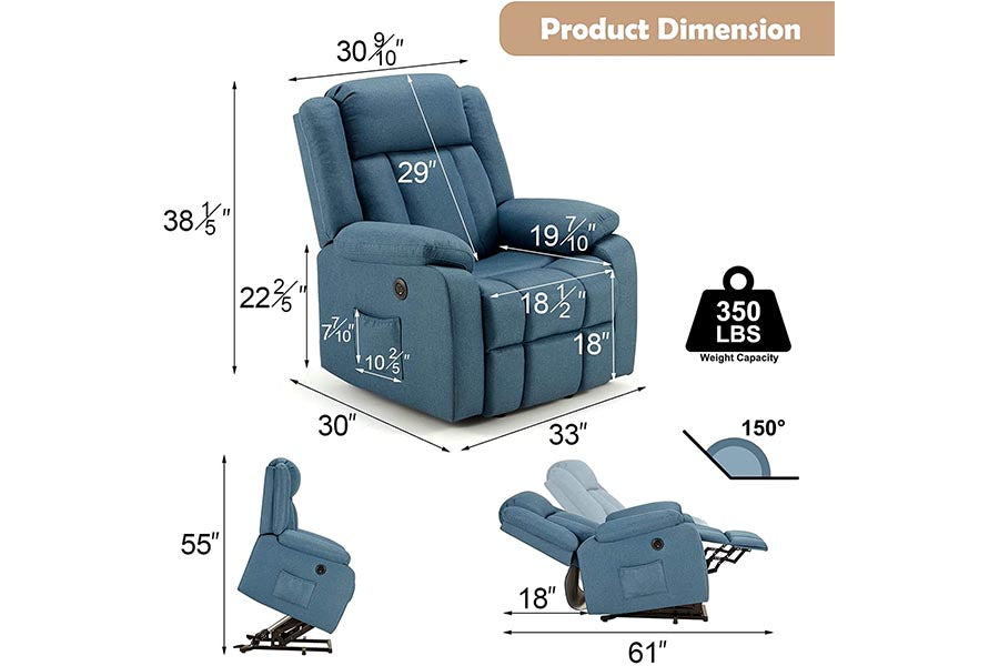 Our new power lift chair will help the senior stand up or lie down with ease, electric powered lift mechanism could lift you up smoothly and safely. Control buttons on the arm activates transitions between reclining, sitting and lifting and can stop at any position in-between with ease. With retractable footrest and adjustable backrest, our lift chair is functional for optimal comfort, perfect for reading, sleeping or napping. Conforming to ergonomic principle, the massage recliner chair supports your neck, arm, back, and legs in the correct angle so as to offer utmost comfort. Featuring 8-point massage system and 5 modes of vibrating massage, it is ideal for anxiety and tiredness relief, especially suitable for those working for long sessions. You can quickly assemble the item and use it with an easy-to-understand manual. Durable metal frame gives this chair stability and strength, and the resilient microfiber upholstery stands up to long time use in your home while bringing ultimate comfort.